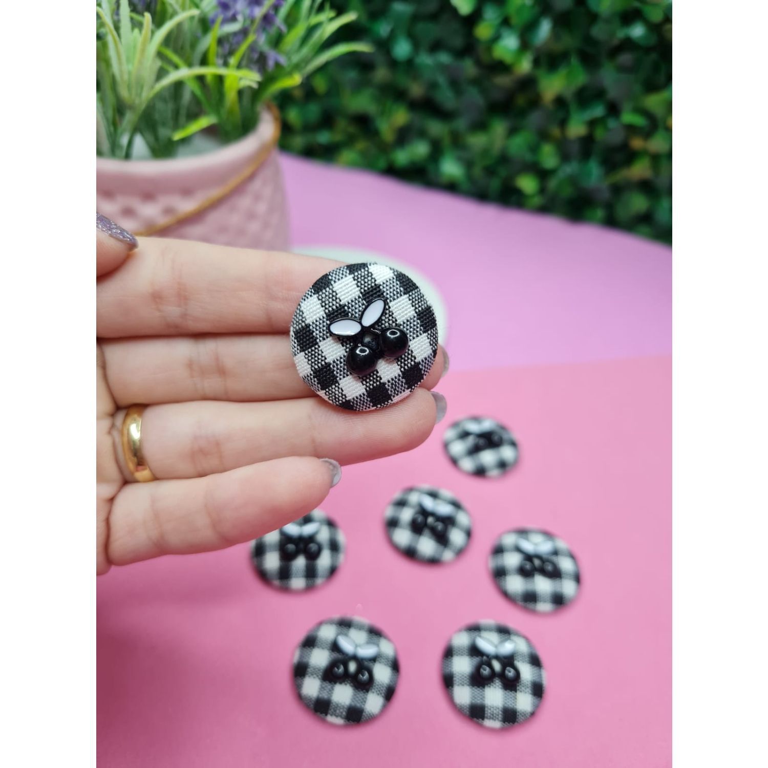 Aplique de Tecido Redondo Xadrez Preto com Cereja 2,5cm - Unidade