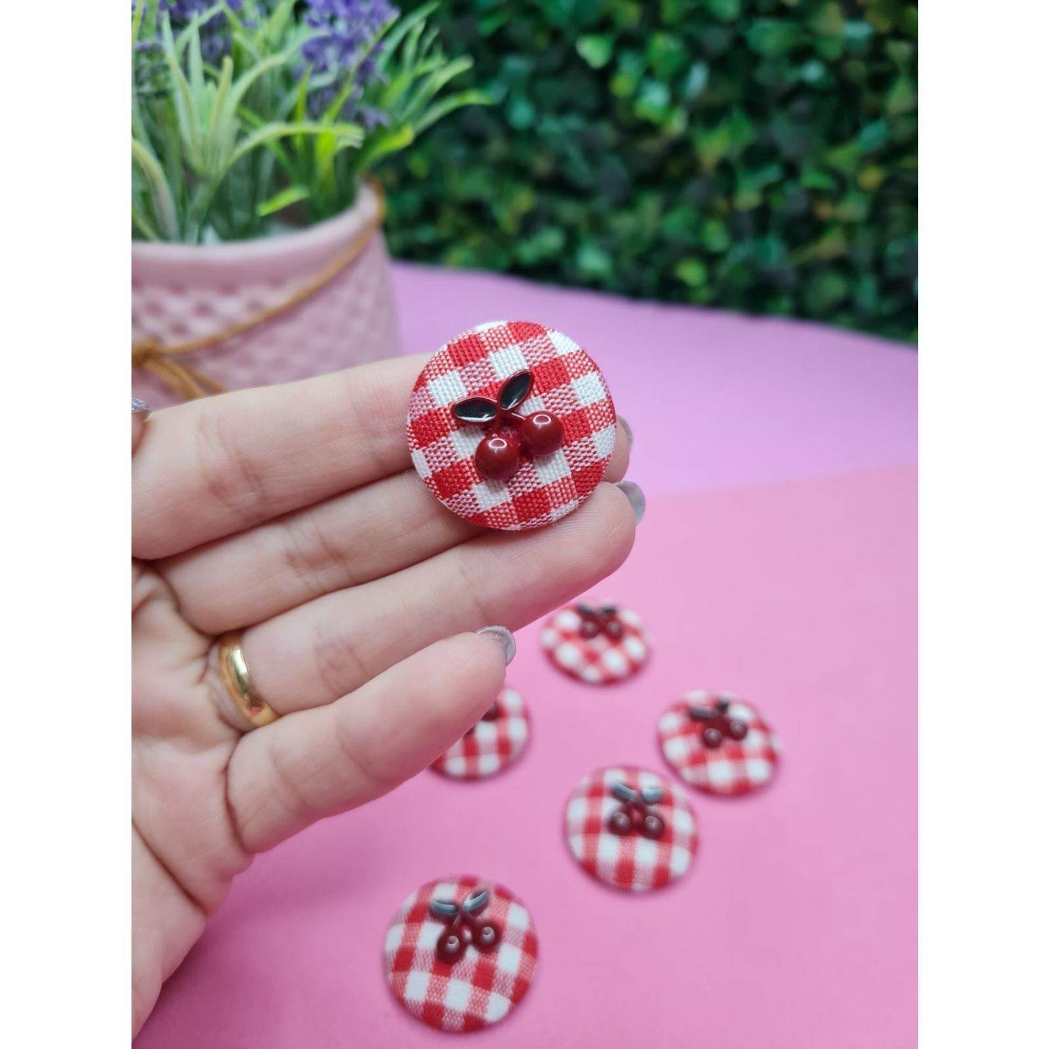 Aplique de Tecido Redondo Xadrez Vermelho com Cereja 2,5cm - Unidade